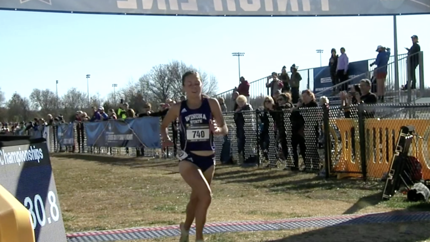 Individually, Winona State's Lindsay Cunningham finished first in 19:30.1. Cunningham won by 15 seconds en route to the cross country individual title.