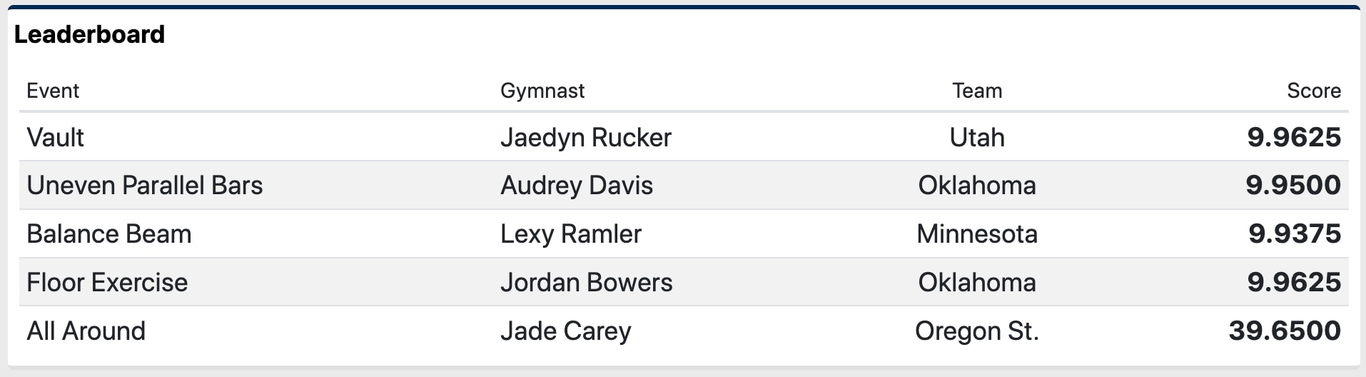 As for the individual competition, Olympic gold medalist Jade Carey placed first in the all-around in Semifinal I. Here are the leaders in each event: