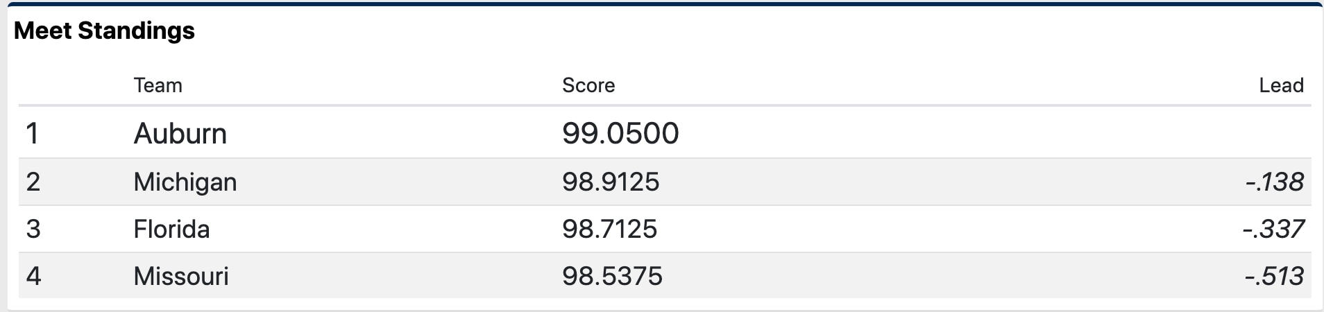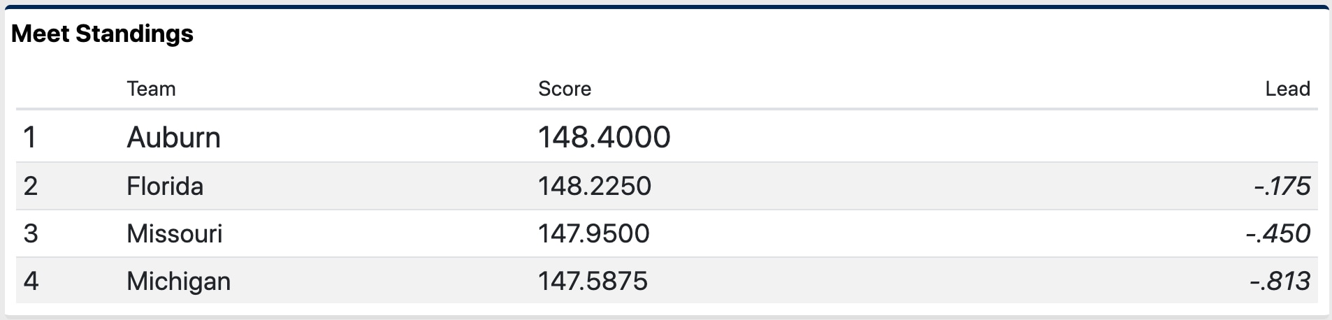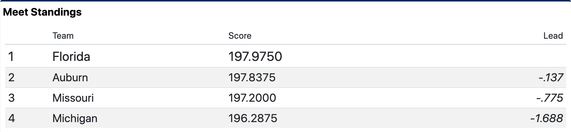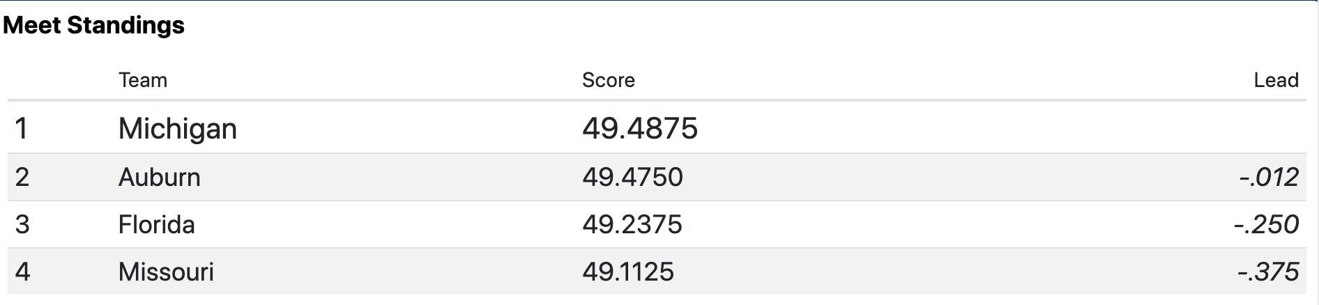 On floor, Michigan had a great rotation with Natalie Wojcik and Gabby Wilson scoring a 9.9125 and Sierra Brooks and Abby Heiskell posting a 9.900 to put Michigan in the lead with a 49.4875. Auburn finished the first rotation in second after a terrific performance from Olympian Suni Lee. Lee anchored the Tigers with a 9.9625 on beam. The Gators are in third after their vault rotation β Leanne Wong, Trinity Thomas and Megan Skaggs put up a 9.900 but had to report two scores under 9.8. Missouri is in fourth heading in the second rotation, with a 49.1125 on bars.
