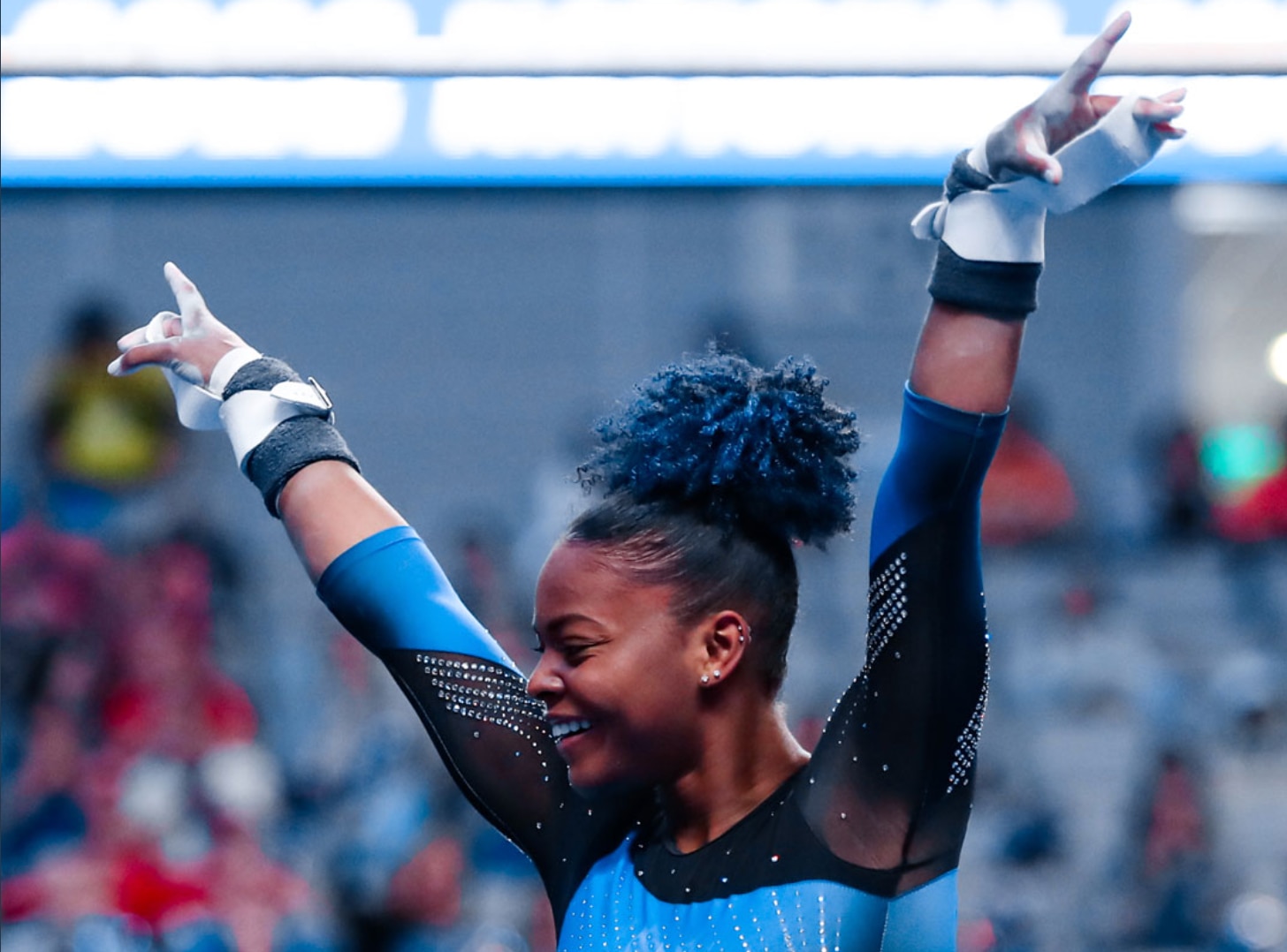 Missouri came in third with a 197.200 and the reigning national champions, Michigan, have been eliminated from the competition after suffering another fall in the last rotation on balance beam and placing fourth.