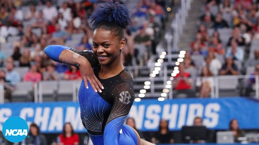 Florida's Trinity Thomas won the all-around title after scoring a perfect 10 on floor. After suffering an injury in 2021, Thomas has been better than ever this season. She completed the season slam at the regionals after posting four perfect 10's and a 39.9 all-around score. In the semifinals, her 39.8125 was enough to secure the all-around title, and on top of that, she was crowned champion on floor and on the uneven bars. Right before her bar routine, there was a technical cable difficulty with the uneven bars that delayed her performance. You would think a delay like that would have affected her performance, but she instead stuck her landing and sent her teammates into a full-blown "perfect 10" chant. She scored just short of perfect, with a 9.9750.