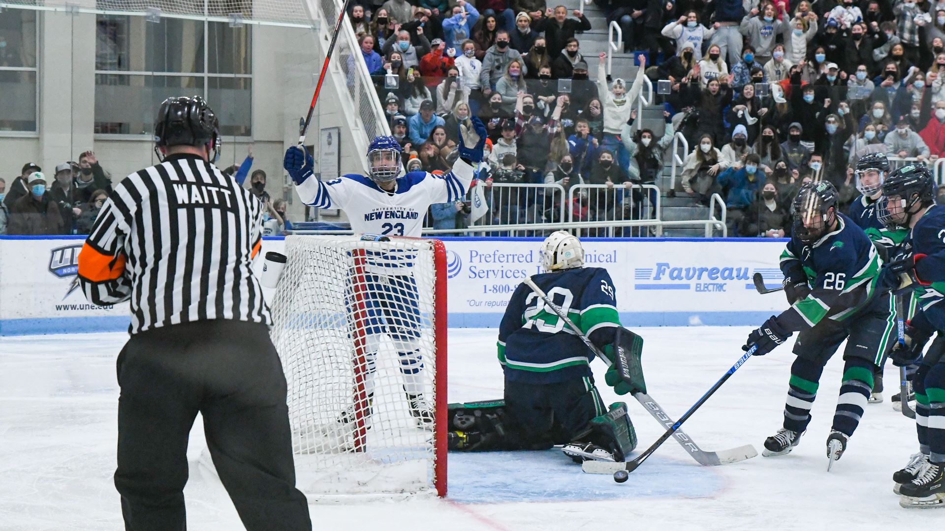 After a scoreless first period in the first of four DIII men's hockey quarterfinals on Saturday, U New England struck first in the second period, taking a 1-0 lead on Daniel Winslow's short-handed goal, and U New England added another goal, an empty-netter, from Tyler Seltenreich in the third period to win 2-0.