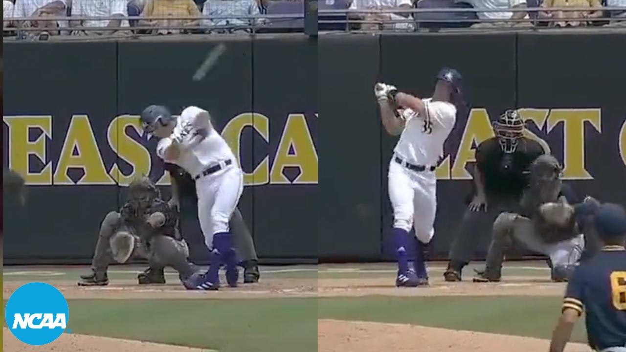 Worrell opened the bottom of the third inning as the first batter, batting right-handed, and hit a solo dinger to left field, putting the Pirates up 5-1. Then with two outs and East Carolina holding a 9-1 lead, Worrell returned to the plate, this time batting left-handed, and he hit a three-run homer.