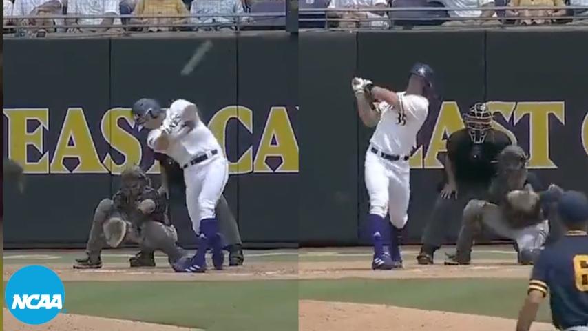 East Carolina's Bryson Worrell kicked off the first round of the DI baseball tournament with a bang, not once but twice, against Greenville Regional opponent Coppin State.
