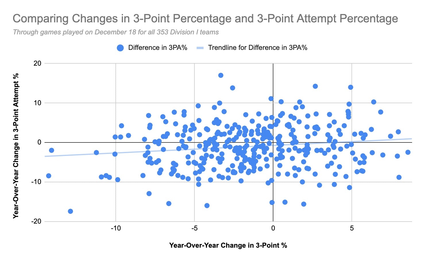 We graphed every Division I team's change in 3-point percentage from last season to this season, as well as each team's change in 3-point attempt percentage (meaning what percent of their total shot attempts were threes) from 2018-19 to 2019-20, and found that there isn't a sport-wide trend in changes in 3-point attempt percentage consistently affecting 3-point percentage.