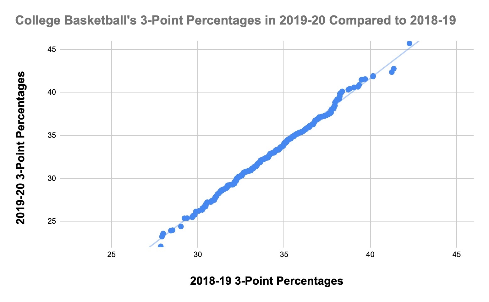 You'll see that around the 40-percent mark on the y-axis, which represents the current season, there start to be more points located above the trend line, showing a relative increase in 3-point percentage among the national leaders compared to last season. For example, this season's best 3-point shooting team, Saint Mary's, has a better 3-point percentage than the best 3-point shooting team last season, Lehigh, so the top point is above the trend line.