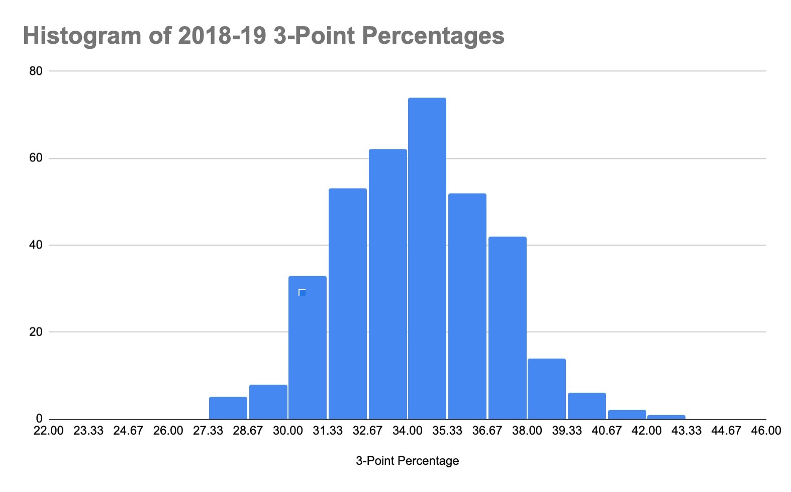 Below are histograms from the 2018-19 and 2019-20 seasons to support the notion that there are fewer average 3-point shooting teams. You'll notice longer "tails" on the second histogram as the 353 Division I teams are less concentrated by 3-point shooting percentage this season compared to last.