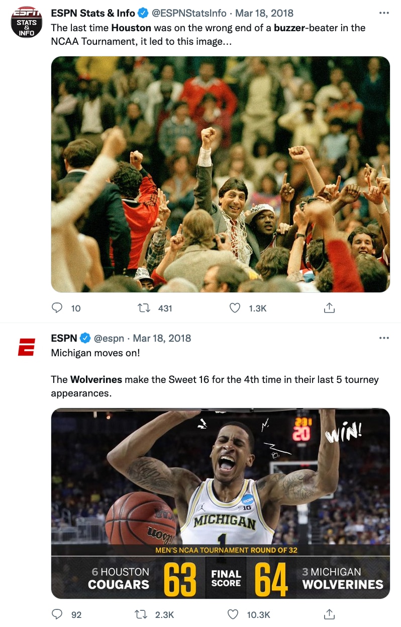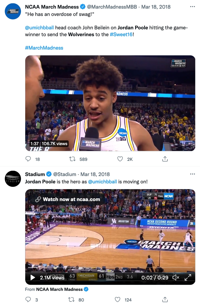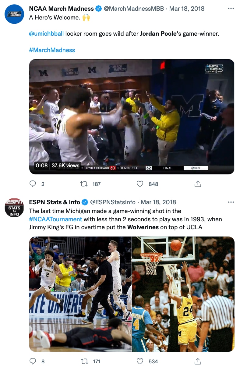 That was CBS' Brad Nessler's call of Michigan guard Jordan Poole's game-winning buzzer-beater over No. 6 seed Houston in the second round of the 2018 NCAA tournament — tied for the fifth-longest game-winning buzzer beater in the history of the NCAA men's basketball tournament — Michigan's 11th win in a row, en route to the Wolverines' eventual run to the national championship game for the second time in six seasons.