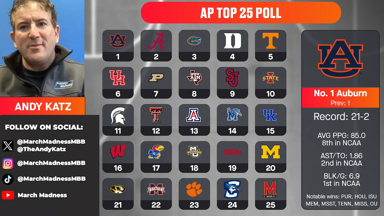 Following another thrilling weekend of men's college basketball, Auburn reclaims the top overall seed in Andy Katz's latest bracket projections.