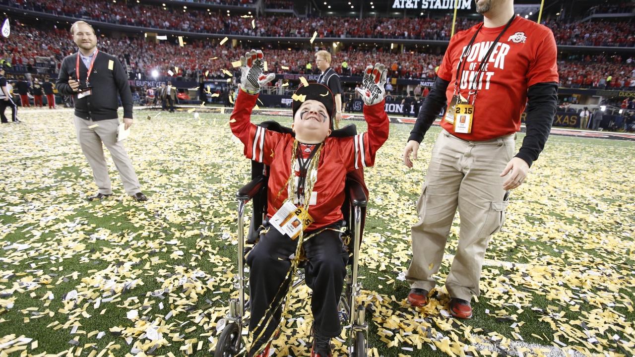 Buckeyes superfan Jacob Jarvis, who suffers from muscular dystrophy, was sent into the huddle by coach Urban Meyer for the final play of the game for Team Scarlet, lining up to the right of starting quarterback J.T. Barrett. Barrett handed it off to Jarvis, who coasted into the end zone to punctuate the 44-31 Scarlet victory.