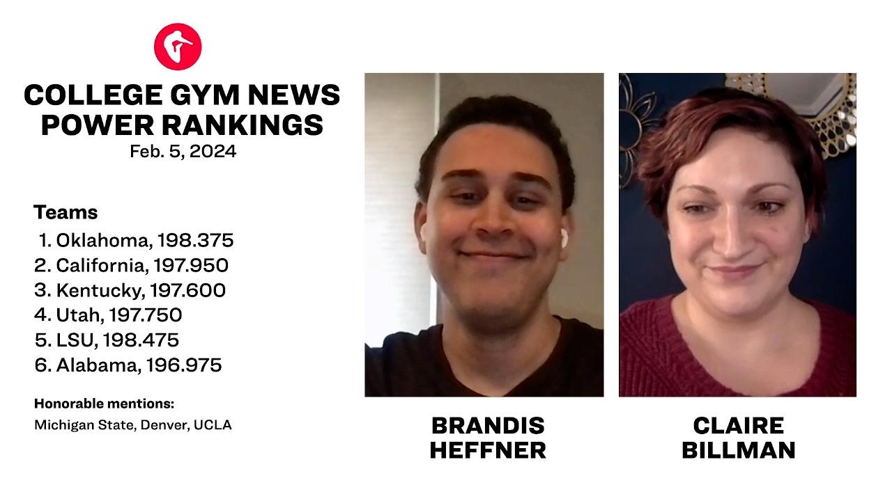 The weekendâs marquee matchup was a showdown between No. 1 Oklahoma and No. 2 California in a tri-meet at Arizona State, in which the Sooners and Golden Bears impressed as expected. Oklahoma took the win with its biggest total of the season while Cal finished right behind with yet another score in the 197.9s. The Sooners stay undefeated in their quest for a three-peat, and the Golden Bearsâ consistency has them a consensus No. 2âeven if theyâre not posting the highest total every weekend.