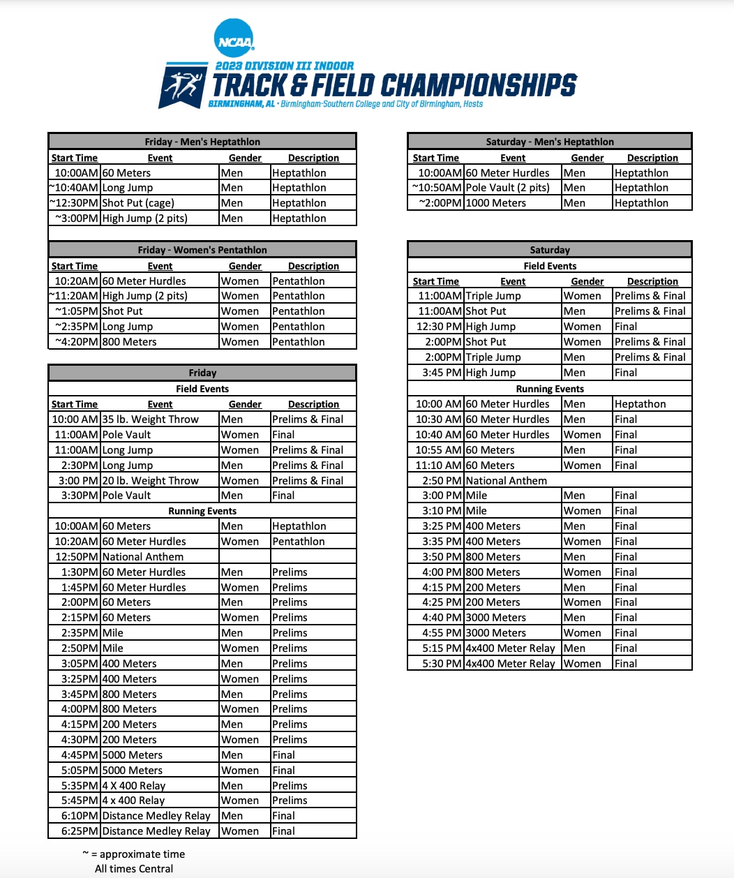For each men’s individual event contested, including the heptathlon, the top 20 declared student-athletes were accepted into the competition. For each women’s individual event contested, including the pentathlon, the top 20 declared student-athletes were accepted into the competition. For each relay event contested, the top 12 declared relay teams, one per institution, were accepted into the competition. The championships will be held March 10-11 at the Birmingham CrossPlex in Birmingham, Alabama, with Birmingham-Southern College and the City of Birmingham serving as hosts.