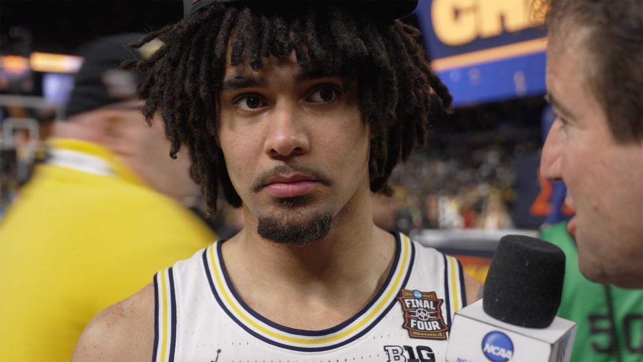 Andy Katz talks with Yaxel Lendeborg after Michigan's National Championship Win