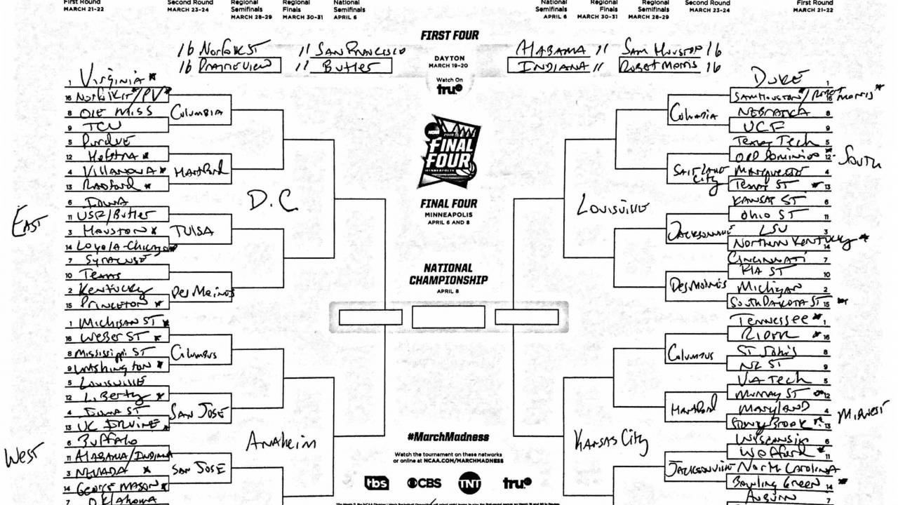 | 1 | Virginia | Michigan St. | Duke | Tennessee |