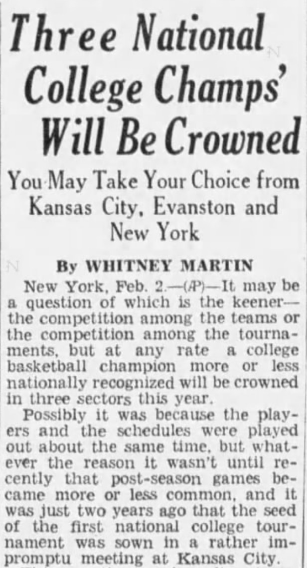 Ultimately, the AP story compared the crowning of a basketball champion in an age with three competing postseason tournaments to that of wrestling and its various weight classes.