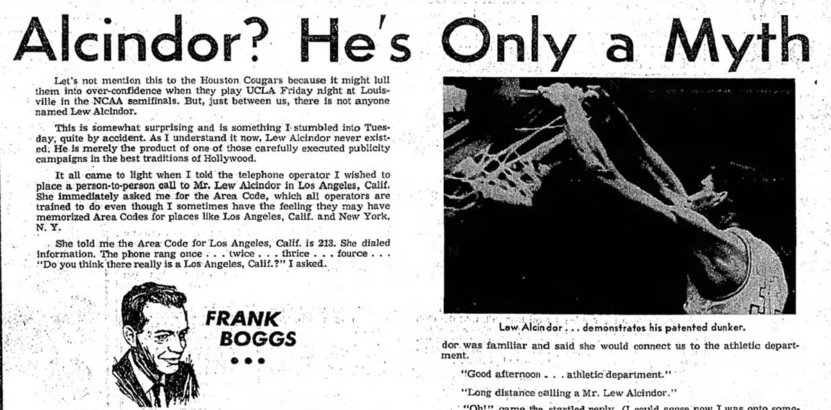 Chicago Tribune: "Did you hear about Lew Alcindor chopping down the cherry tree and then confessing to the Establishment, 'Father, I cannot tell a lie!'? Did you hear about Lew Alcindor driving the snakes from Ireland? Have you heard about Lew Alcindor, the boy, splitting rails in downstate Illinois? You probably have listened to all these tales, and more, too, because Lew Alcindor — star sophomore on the University of California at Los Angeles basketball team — is the most publicized athlete of our time."