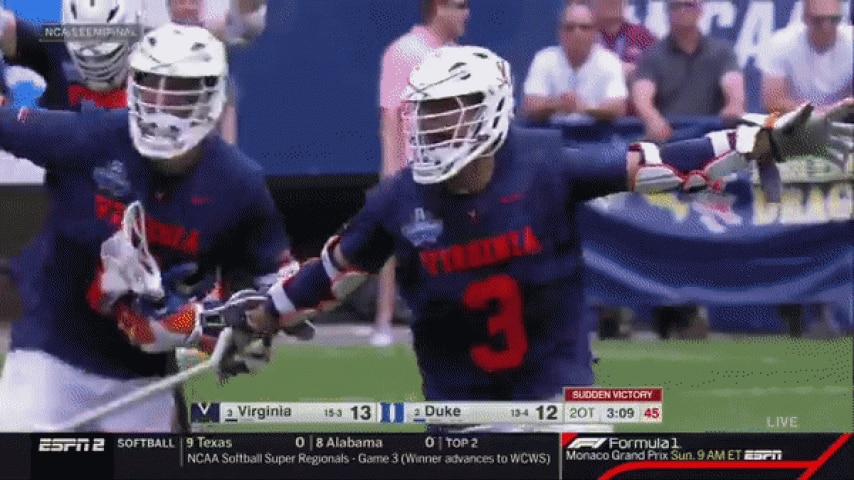 UVA advanced to the championship game thanks to a double overtime game-winner from Ian Laviano against ACC rival Duke. The Cavs won the back-and-forth affair 13-12.
